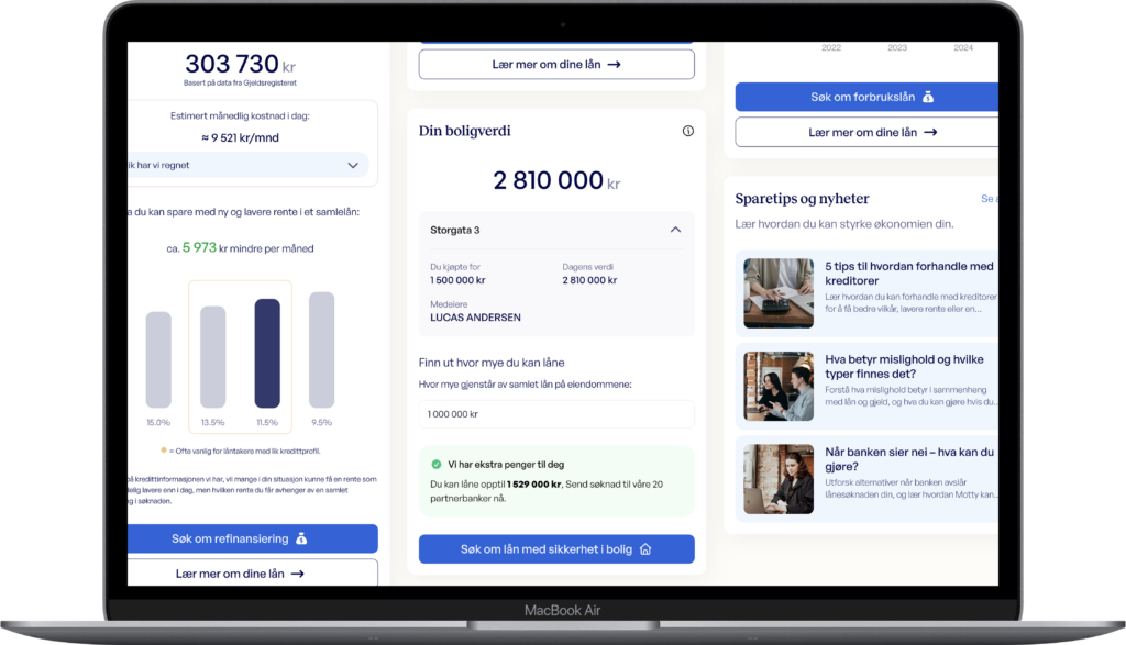 I Min Motty kan du se et estimat på hva boligen din kan være verdt. Det gir deg en enkel oversikt og kan være nyttig hvis du er nysgjerrig på økonomien din eller vurderer refinansiering senere. Du bestemmer selv om du vil gjøre noe videre.