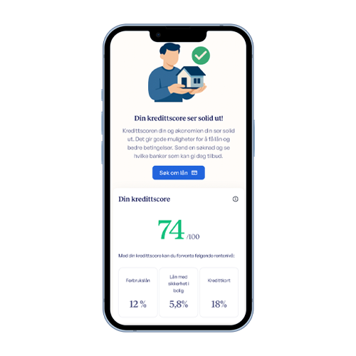 Du kan sjekke kredittscoren din kostnadsfritt i Min Motty. Her får du også innsyn i noen av tallene som er med på å påvirke hvordan banker vurderer økonomien din. Dette er bare informasjon til deg – ikke en søknad.