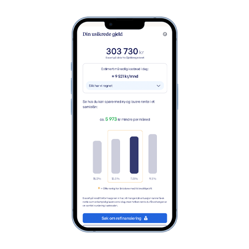 Hvis du har flere lån eller kredittkort, kan du få et estimat på hvor mye du kanskje kan spare ved å samle gjelden. Dette er kun en oversikt basert på tallene dine, så du kan vurdere i ro og mak hva som kan være aktuelt for deg.